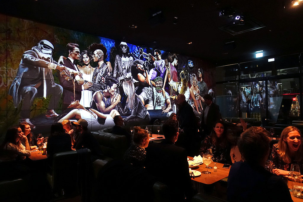 There will definitely be people who will love it and others who will loathe it. I for one am happy with the interior decoration, just keep in mind that this place is really big, so no cosy dive for 20 people. The eye catcher of that place is the huge ass moving graffiti wall.