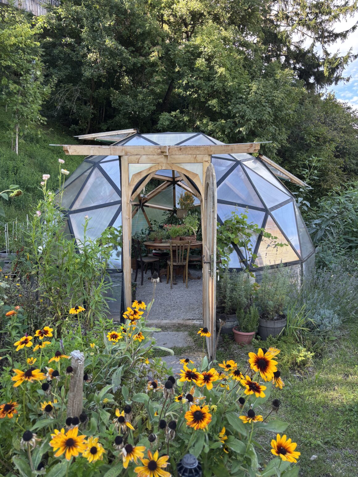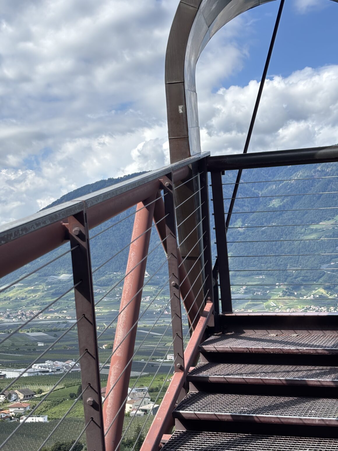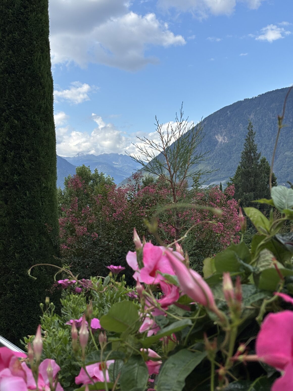 We wandered through cactus gardens, the “Garden of Love,” and even a giant birdhouse filled with singing tropical birds. With the mountain peaks of Merano in the background, it felt surreal, like stepping into a painting. By the time we left, our step counter already read 7,000.